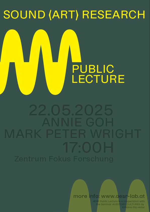 The lecture is part of the ÆSR Lab – Applied/Experimental Sound Research Laboratory. ÆSR Lab is a cooperation project of the University of Applied Arts Vienna (Centre Focus Research) and the Artistic Research Center (ARC), the Institute for Composition, Electroacoustics and Tonmeister:innen-Ausbildung (IKE) of the mdw - University of Music and Performing Arts Vienna and the Phonogrammarchiv of the Austrian Academy of Sciences. ÆSR Lab is funded by the BMBWF and in co-operation with the Recovery and Resilience Facility (RRF) of the EU.