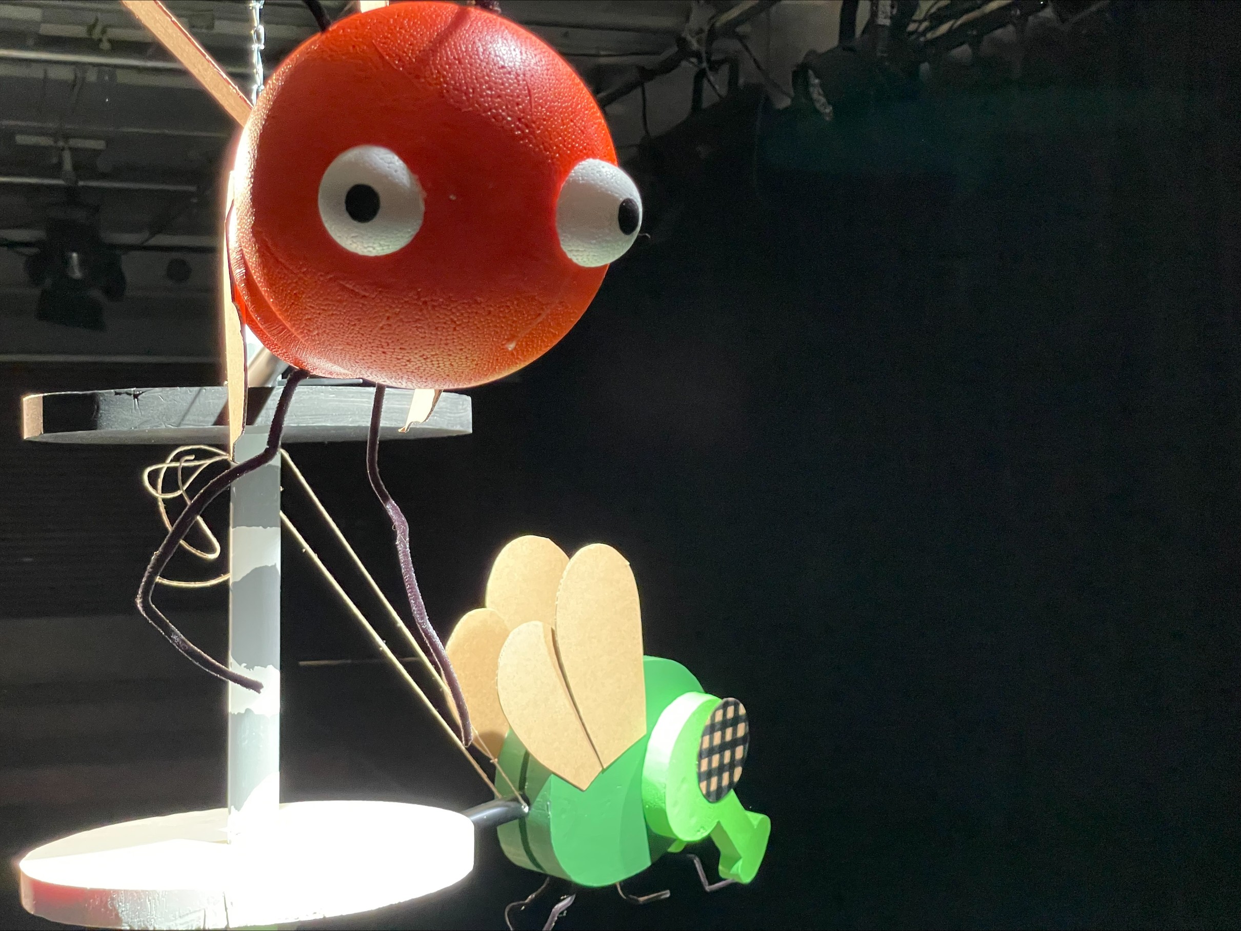 Gebilde aus Schläuchen fallen von der Decke und treffen auf Sitzskulpturen, die einen umschlingen. Hemma Bergner, Camilla Hagenauer, Magdalena Prieler, Mirijam Schleicher, und Natascha Stierli gingen der Frage nach, wie sich Körpererfahrungen wie Sitzen, Liegen, Bewegen mit den Wahrnehmungen von Hören, Zuhören, Sehen, Zusehen, Schauen und Zuschauen verknüpfen lassen. Über taktile Empfindungen lassen sich Schlingen, Finger, Knoten und Löcher erfühlen und erweitern damit den Wahrnehmungsraum des Theaters.